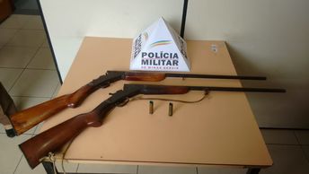 Os militares encontraram então duas espingardas de calibre permitido e diversas munições calibre .22 e .36. O autor relatou também possuir um revolver cal.38 e que na noite anterior teria jogado ele no quintal próximo a um paiol, buscas foram realizadas no local, porém sem êxito.