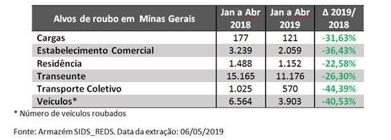 Todos os 12 crimes monitorados mensalmente pelo Governo de Minas tiveram queda na comparação entre os quatro primeiros meses de 2019 e o mesmo período de 2018 (ver quadro). O resultado é o melhor dos últimos sete anos na avaliação do quadrimestre, segundo o Observatório de Segurança Pública Cidadã, da Secretaria de Estado de Segurança Pública (Sesp).