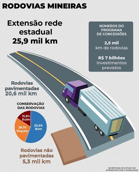 Minas Gerais possui a maior malha rodoviária do Brasil, equivalente a 16% de toda a malha de estradas existente no país. No estado, são 273 mil quilômetros de estradas, sendo 8.881 quilômetros de rodovias federais, 25.933 quilômetros estaduais – sob gerenciamento do Departamento de Edificações e Estradas de Rodagem (DEER/MG) – e 238.191 quilômetros de vias municipais. Atualmente, existem em Minas Gerais duas concessões rodoviárias estaduais vigentes, a da MG-050, com 371 quilômetros de extensão, e a da BR-135, com total de 364 quilômetros concedidos. O diretor-geral do DEER, Fabrício Torres Sampaio, também participou do lançamento do programa.