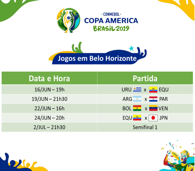 O gigante da Pampulha vai receber ainda outras seis seleções, com os jogos Argentina x Paraguai, Bolívia x Venezuela e Equador x Japão que se enfrentam, respectivamente, nos dias 19, 22 e 24 de junho pelos jogos da primeira fase da competição. O estádio receberá também uma das semifinais da disputa, no dia 2 de julho, com possibilidade de um jogo do Brasil, caso a seleção avance em primeiro lugar da sua chave.