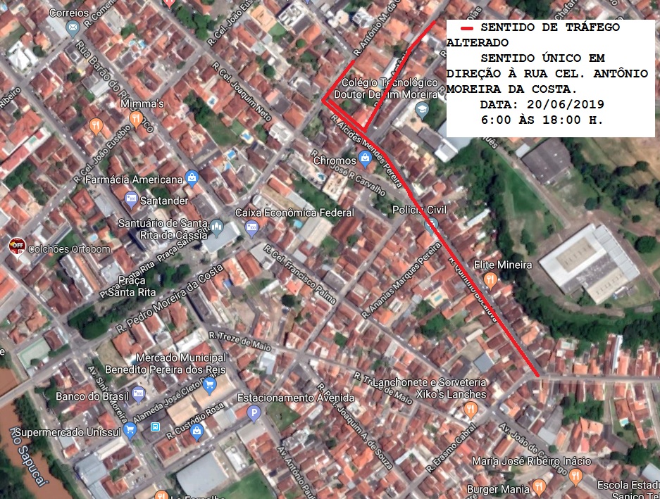 - Os veículos que seguirem pela rua Padre Antônio deverão virar a direita na rua Alcides Mendes Pereira, em à rua Cel. Antônio Moreira da Costa (CEMIG);