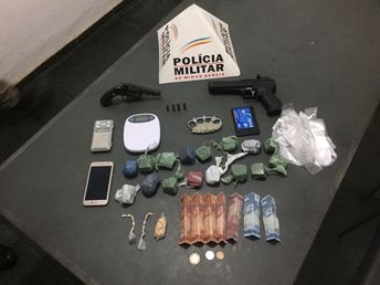 A PM cumpriu mandado de busca e apreensão no endereço e durante buscas no imóvel encontrou: 10 pedras de crack e mais uma porção da droga, 16 tabletes de maconha, 01 revólver calibre 32, carregado com 04 munições, 02 balanças de precisão, 01 réplica de pistola, cerca de R$50,00 (cinquenta reais) em dinheiro, 01 celular e diversas embalagens.