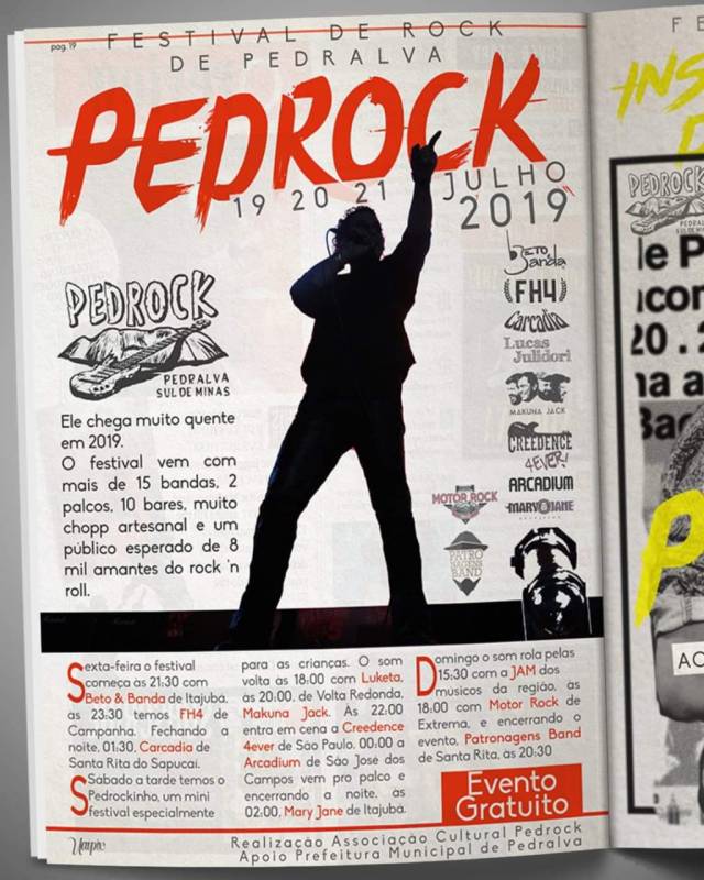 A Associação Cultural Pedrock realiza o evento com ACESSO GRATUITO e bandas de altíssimo nível na Avenida Dr. Jorge Bacha nos dias 19, 20 e 21 de Julho de 2019 em Pedralva.