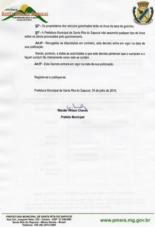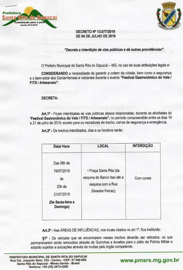 A Praça Santa Rita será fechada ao trânsito de veículos, da esquina do Banco Itaú até a Rua Silvestre Ferraz entre os dias 19 e 21 de julho, conforme o decreto municipal abaixo: