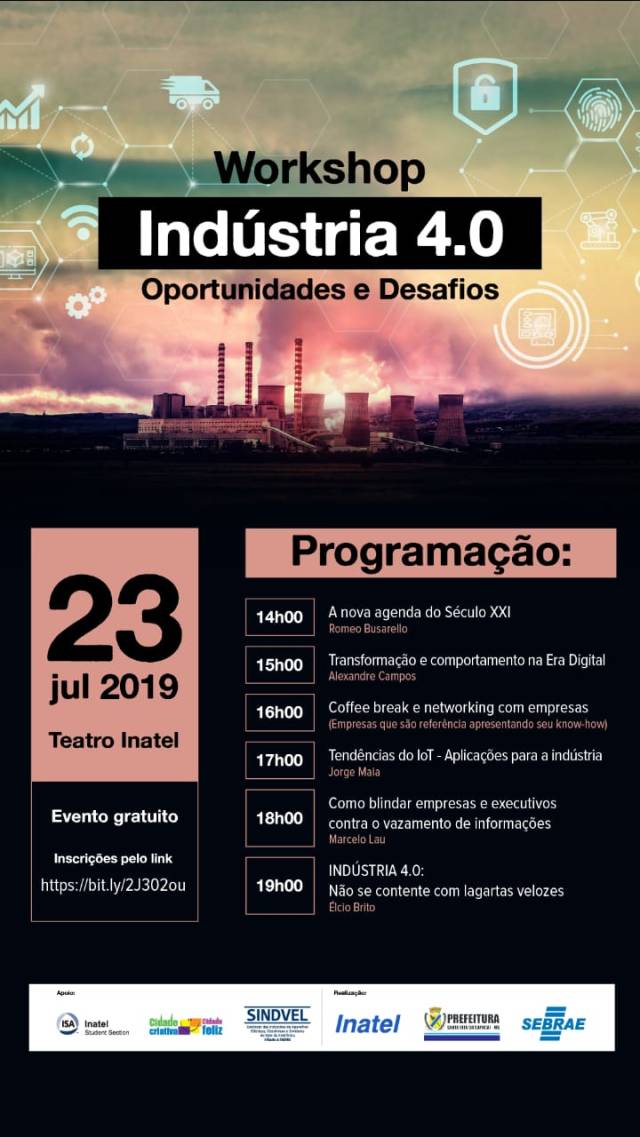 O assunto será discutido no Workshop Indústria 4.0 – Oportunidades e Desafios, promovido pelo Sebrae Minas, Inatel e Prefeitura de Santa Rita do Sapucaí. O evento acontece nesta terça-feira (23/07), às 14h, no Teatro Inatel (av. João de Camargo, 510, centro, em Santa Rita do Sapucaí). Serão cinco palestras gratuitas, ministradas por profissionais de referência no setor. As inscrições são gratuitas e podem ser feitas no link:https://docs.google.com/forms/d/e/1FAIpQLScxz6SPAu4vRbJ3BvZ8lzkSl984EHInUM2t_gFQaKOD8hHwiw/viewform