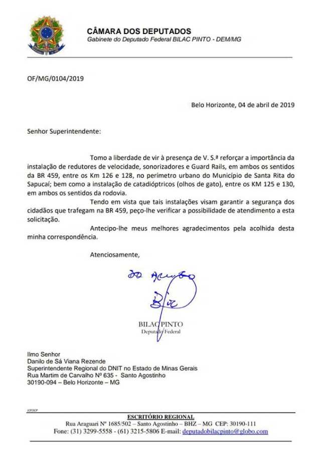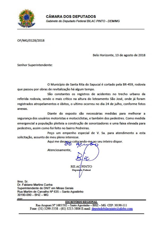 Juntamente com o prefeito Wander Chaves solicitamos o empenho do Deputado Bilac Pinto, nesta questão. Bilac Pinto enviou ao DNIT o ofício N° 0104/2019 fazendo as mesmas solicitações.
