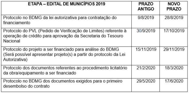 Com a prorrogação do prazo, as prefeituras também ganharam mais tempo em relação às demais etapas do edital (vide tabela abaixo). Ao todo, o BDMG disponibilizou R$ 200 milhões em quatro linhas de crédito para projetos de construção, reforma e ampliação de edificações municipais; mobilidade e drenagem urbana; eficiência energética; e aquisição de máquinas rodoviárias, caminhões e equipamentos para pavimentação.