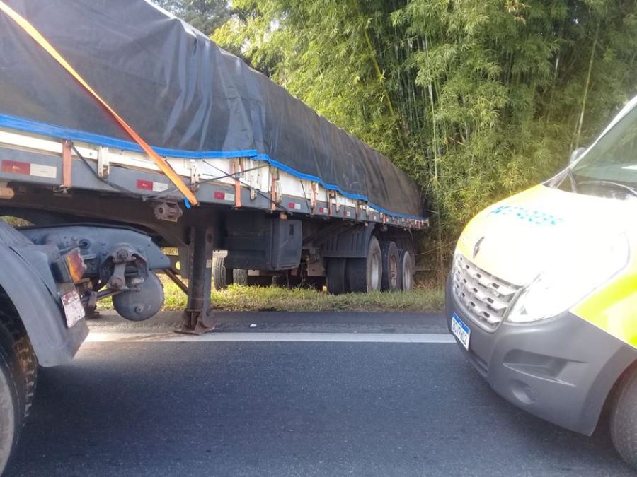 Carreta tem ‘pane seca’, volta de ré e sai da pista na Fernão Dias
