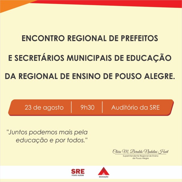 Acontece neste dia 23 de agosto o I Encontro Regional, com a presença dos 30 Prefeitos e Secretários Municipais de Educação que participam da Superintendência Regional de Ensino de Pouso Alegre.