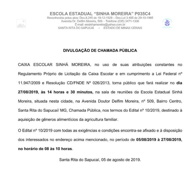 Escola Estadual Sinhá Moreira – Divulgação de Chamada Pública