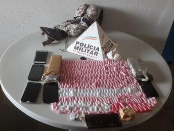 A PM recebeu denúncia que estava ocorrendo tráfico de drogas no endereço e ao averiguar a informação localizou 02 tabletes de maconha e 01 mais uma porção da droga, 01 pedra grande de crack, 01 porção de cocaína e mais 403 pinos da droga, prontos para serem comercializados e 06 celulares.