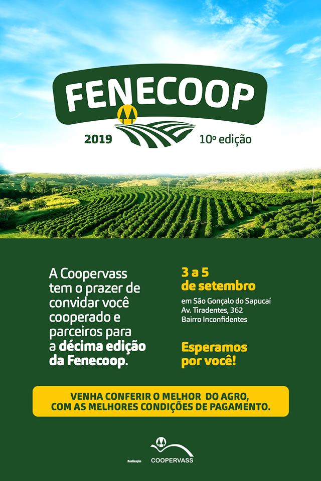 A Coopervass promove a 10ª edição da Fenecoop, feira que se realiza nos dias 3, 4 e 5 de setembro, com atrações imperdíveis para o produtor rural. A Fenecoop congrega parcerias importantes, com condições de oferecer inovações, insumos, máquinas e as melhores oportunidades de negociações para os produtores rurais planejarem e desenvolverem ações importantes no desenvolvimento do seu agronegócio.
