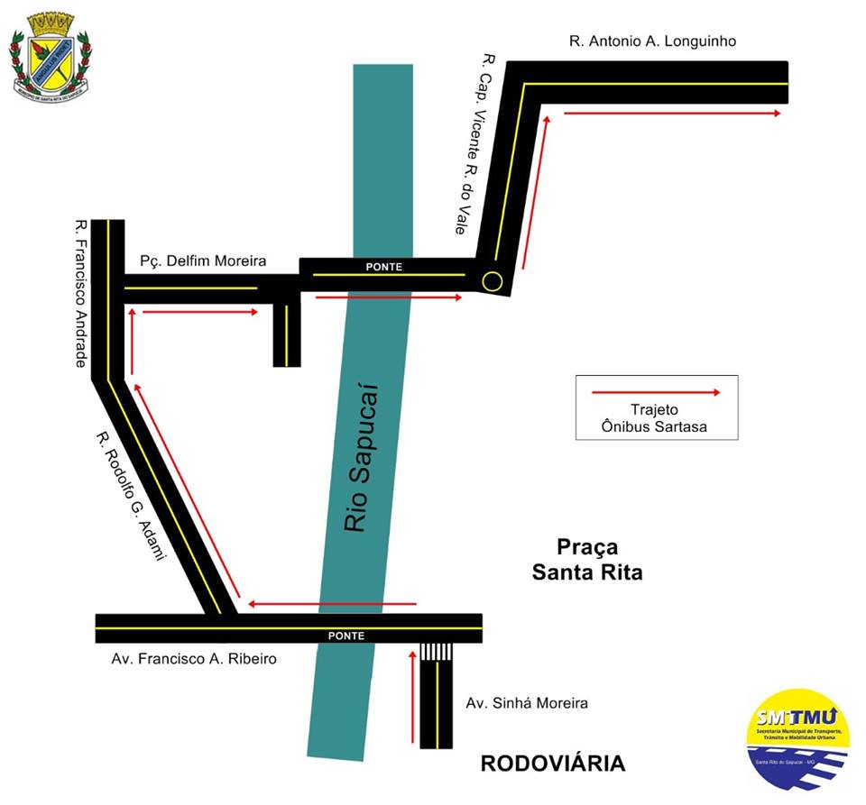 Os ônibus sairão da rodoviária passando pela ponte, Rua Rodolpho Guerino Adami, Rua Francisco Andrade, Praça Dr Delfim Moreira, Ponte José Neves e vira à esquerda na Rua Capitão Vicente Ribeiro do Vale (Rua do Queima) e Rua Antônio Assis Longuinho.