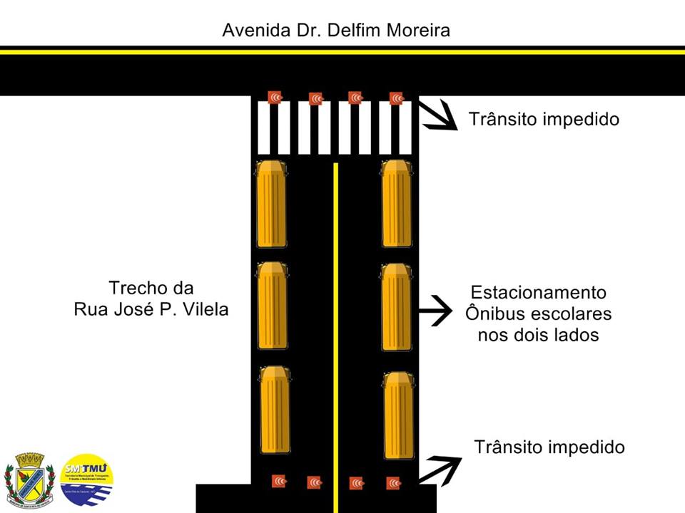 Os ônibus e micro ônibus escolares deverão estacionar na Rua Dr José Pinto Vilela em filas entre a Rua Antônio Assis Longuinho e Av. Dr Delfim Moreira, conforme a imagem abaixo: