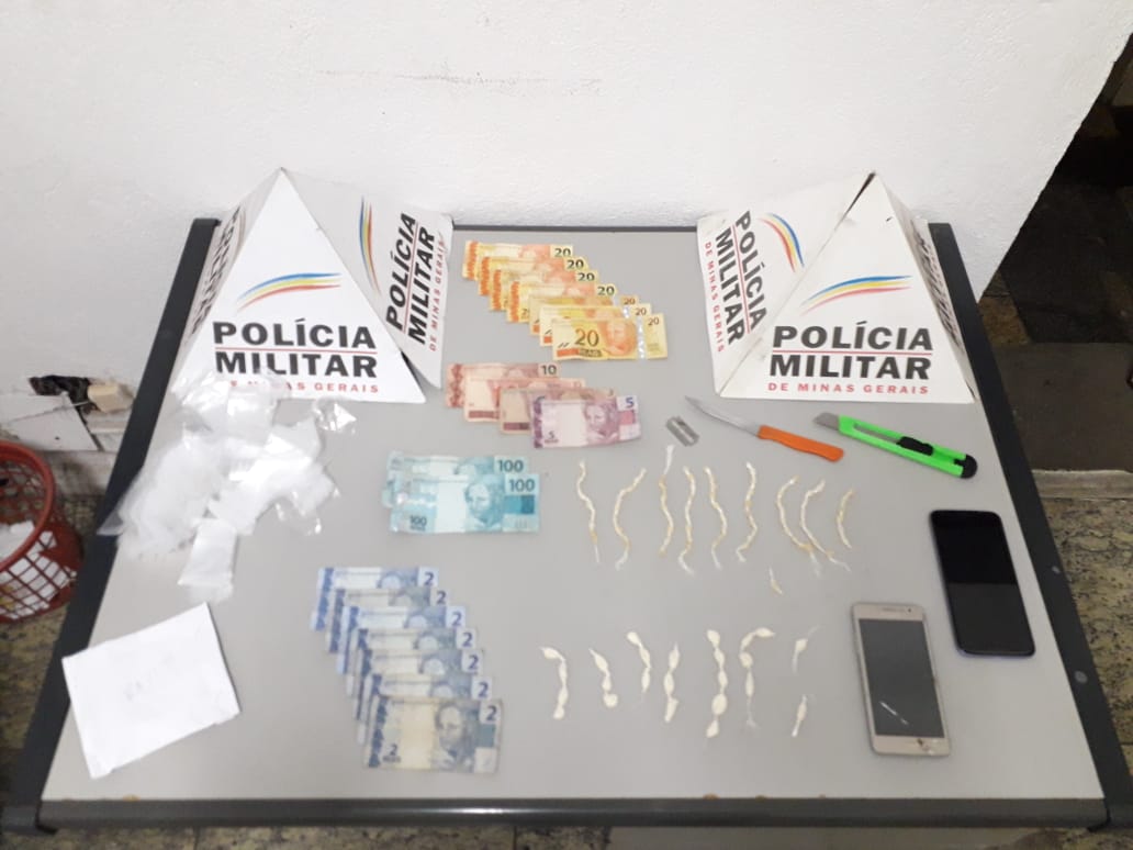 Dentro de uma pochete que estava na cintura de dele também foi localizada a quantia de R$30,50 (trinta reais e cinquenta centavos) e um celular de cor preta da marca Samsung, modelo A30 e várias caixa de lâmina. Sob a posse da jovem, foi encontrado o celular Samsung, de cor preta, modelo J5.