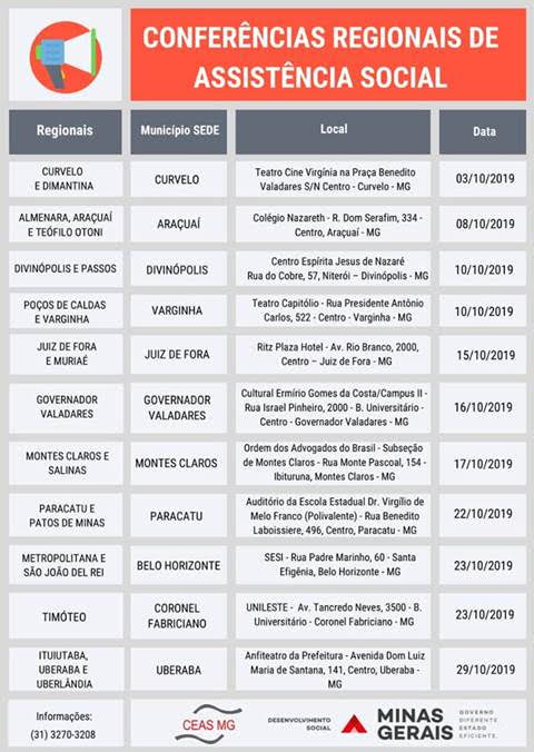 O Conselho Estadual de Assistência Social (Ceas), órgão vinculado à Secretaria de Estado de Desenvolvimento Social (Sedese), realiza no período de 3 a 29 de outubro, em 11 municípios-sede, as Conferências Regionais de Assistência Social, preparatórias para a 13ª Conferência Estadual de Assistência Social, que será realizada até o dia 20 de novembro, em Belo Horizonte.