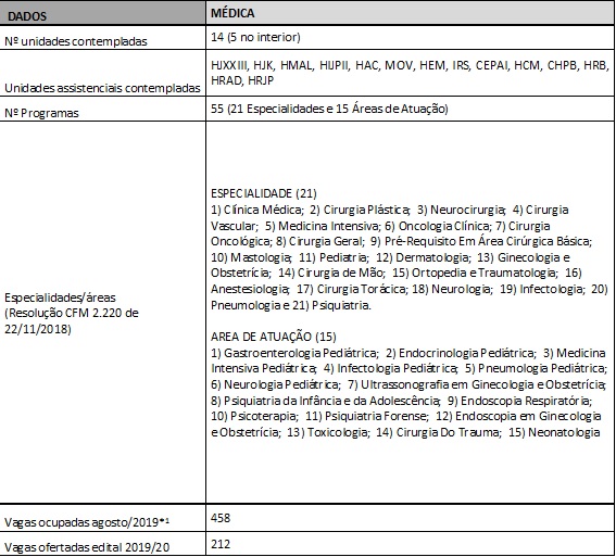 Ao todo, são 212 vagas ofertadas, para 55 programas em 21 especialidades e 15 áreas de atuação: Clínica Médica, Cirurgia Plástica, Toxicologia, Neurocirurgia, Cirurgia do Trauma, Cirurgia Vascular, Medicina Intensiva, Oncologia Clínica, Cirurgia Oncológica, Cirurgia Geral (pré-requisito em área Cirúrgica Básica), Mastologia, Pediatria, Neonatologia, Gastroenterologia Pediátrica, Endocrinologia Pediátrica, Infectologia Pediátrica, Pneumologia Pediátrica, Neurologia Pediátrica, Dermatologia, Ginecologia e Obstetrícia, Endoscopia em Ginecologia e Obstetrícia, Ultrassonografia em Ginecologia e Obstetrícia, Cirurgia de Mão, Ortopedia e Traumatologia, Anestesiologia, Cirurgia Torácica, Endoscopia Respiratória, Psiquiatria da Infância e da Adolescência, Psicoterapia, Psiquiatria Forense, Neurologia, Infectologia, Medicina Intensiva Pediátrica, Pneumologia e Psiquiatria.