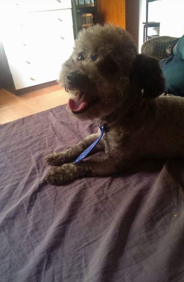 É um poodle cinza, já idoso, está tosado e tem 13 anos.
