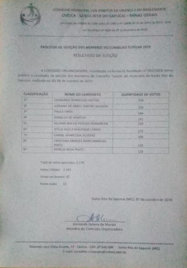 Foram apurados 2179 votos, sendo 2165 válidos, 02 em branco e 12 nulos.