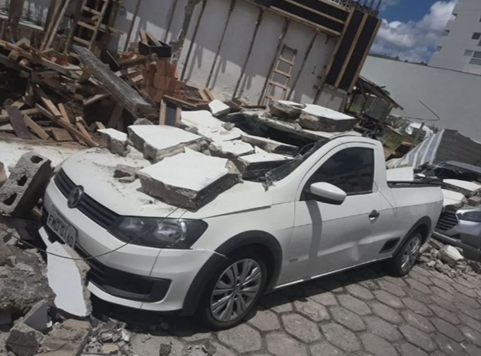 Muro de prédio em obras cai e atinge três carros em Itajubá