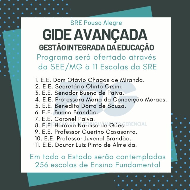Do Sul de Minas a SRE de Pouso Alegre foi a selecionada entre as 17 do Estado de Minas para receber o programa em 11 Escolas Estaduais de Ensino Fundamental. A Superintendente Clícia Beraldo diz que esse projeto é um presente para as Escolas Mineiras e que o objetivo desta ação é auxiliar as gestões escolares e seus servidores à melhorarem os índices se aprendizagem através se ações pedagógicas e administrativas transformadoras.