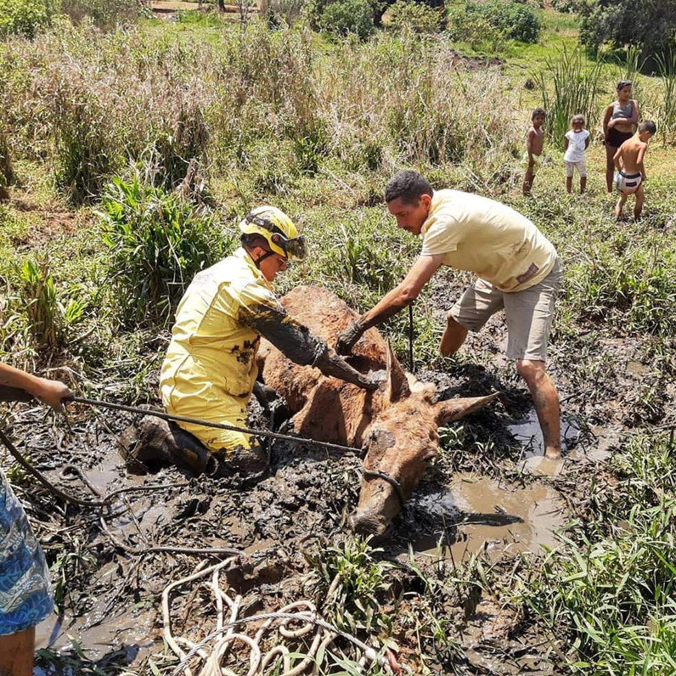 A equipe de salvamento terrestre precisou retirar de um lamaçal de uma mula de cerca de 20 anos na manhã de domingo. Ela ficou atolada até o pescoço após tentar atravessar a área, no bairro Jardim Planalto.
