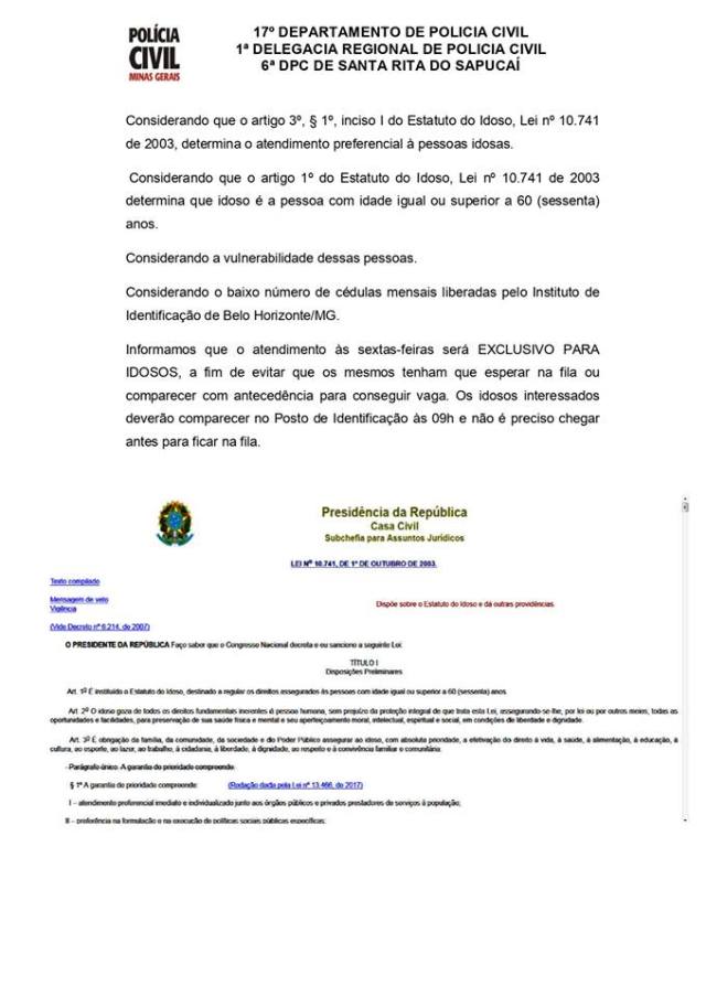 Em Santa Rita do Sapucaí, as emissões de identidade serão feitas no período da manhã, a partir de 09h00, de segunda a quinta-feira.