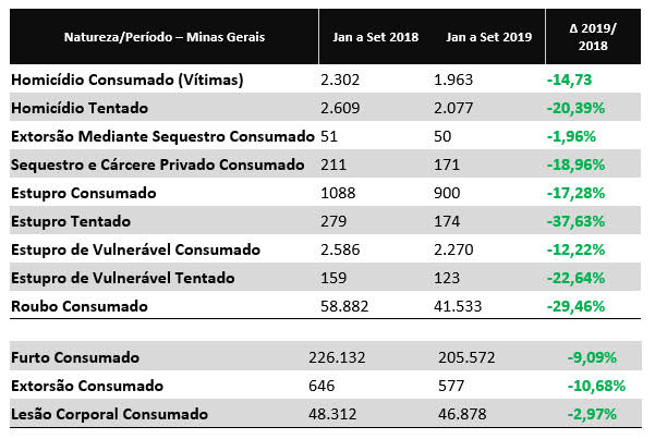 Indicador internacional de violência, o número de vítimas de homicídio também diminuiu 14,7% em Minas. Foram 1.963 vítimas, de janeiro a setembro de 2019, contra 2.302, no mesmo período do ano passado. No interior, 645 municípios – 75,6% do total – não registraram, mantiveram ou reduziram seus índices dessa modalidade criminosa.