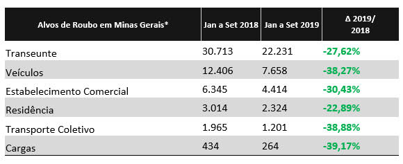 Chama a atenção a diminuição do número de roubos, que chega a quase 30%, com 17.349 registros de ocorrências a menos entre janeiro e setembro deste ano, frente ao mesmo período de 2018. Na prática, isso significa 48 roubos a menos no estado por dia, nos nove primeiros meses de 2019.