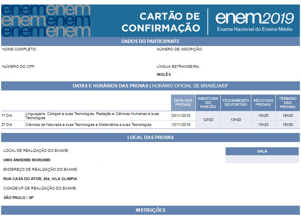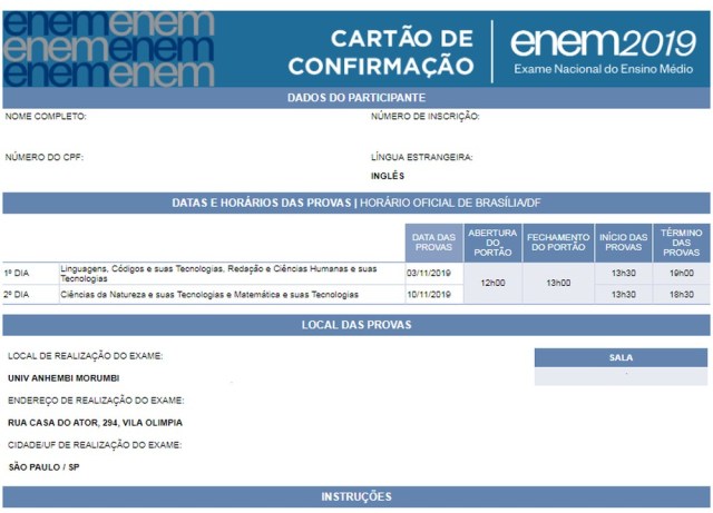 É o documento que confirma a inscrição de cada candidato no Enem, e traz os detalhes sobre o local de provas. Além do nome da rua e número do edifício, o cartão também informa, por exemplo, o número da sala em que cada estudante fará o exame.