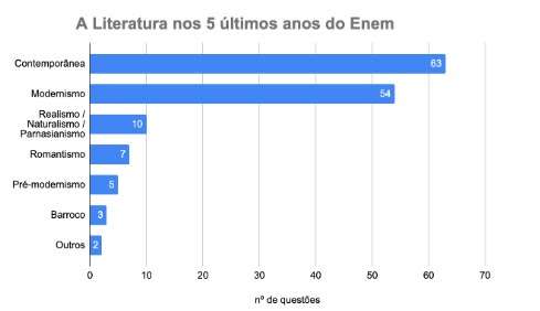 A prova do ENEM tem uma clara tendência à cobrança de autores e obras da Literatura Contemporânea e do Modernismo. “Considerando não só a aplicação principal, mas também a segunda aplicação, a prova PPL (para Pessoas Privadas de Liberdade), os exames cancelados e as provas em Libras, entre 2014 e 2018, o ENEM cobrou 63 itens de literatura contemporânea e 54 de Modernismo”, diz Cícero. “Todas as outras escolas literárias cobradas (Realismo, Naturalismo, Parnasianismo, Romantismo, Pré-modernismo, Barroco, Arcadismo, Classicismo, Simbolismo e Trovadorismo) somam apenas 27 itens nesses cinco anos”, completa o especialista.