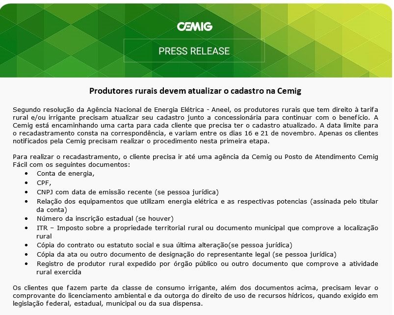 Produtores Rurais devem atualizar o cadastro na Cemig