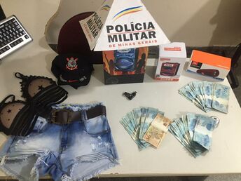 Ao ser abordado foi encontrado de posse de 03 mini caixas de som Bluetooth, roupas ( 01 top, 01 boné e um shorts), 01 pen drive e a quantia de R$ 2.950,00 em moeda corrente.