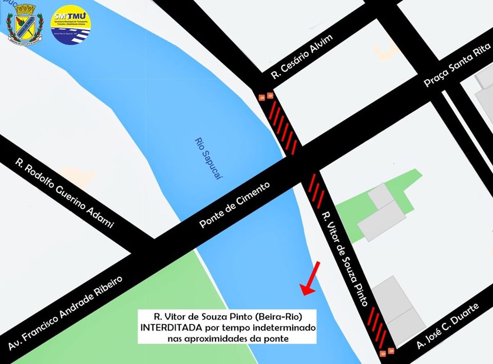Em Santa Rita do Sapucaí, a Secretaria Municipal de Transporte Trânsito e Mobilidade Urbana comunica que em virtude do início das obras da passarela da ponte, a Av. Beira Rio estará com o trânsito impedido a partir de QUARTA FEIRA dia 13, entre a Rua Cesário Alvim e Alameda José Cleto Duarte, conforme mostra a figura abaixo: