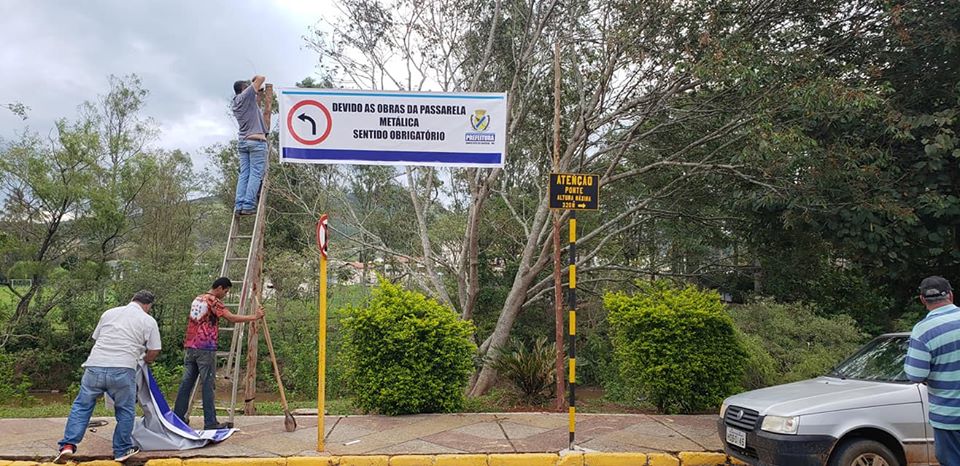Sinalizações referentes às alterações no trânsito que irão ocorrer em decorrência do início das obras da passarela metálica para pedestres ao lado da ponte foram colocadas