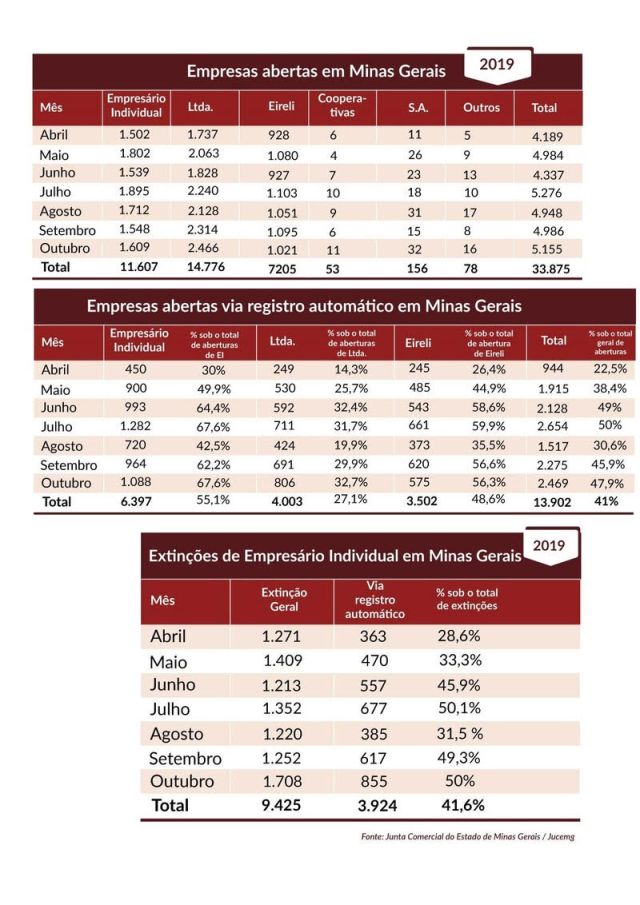 O novo procedimento se aplica à constituição de empresas de menor complexidade, como os empresários Individuais, as Empresas Individuais de Responsabilidade Limitada (Eirelis) e as Sociedades Limitadas (Ltdas.), e também ao ato de extinção do empresário individual. Esses três tipos jurídicos, por sua vez, representam 99,2% de todas as empresas constituídas em Minas no período.