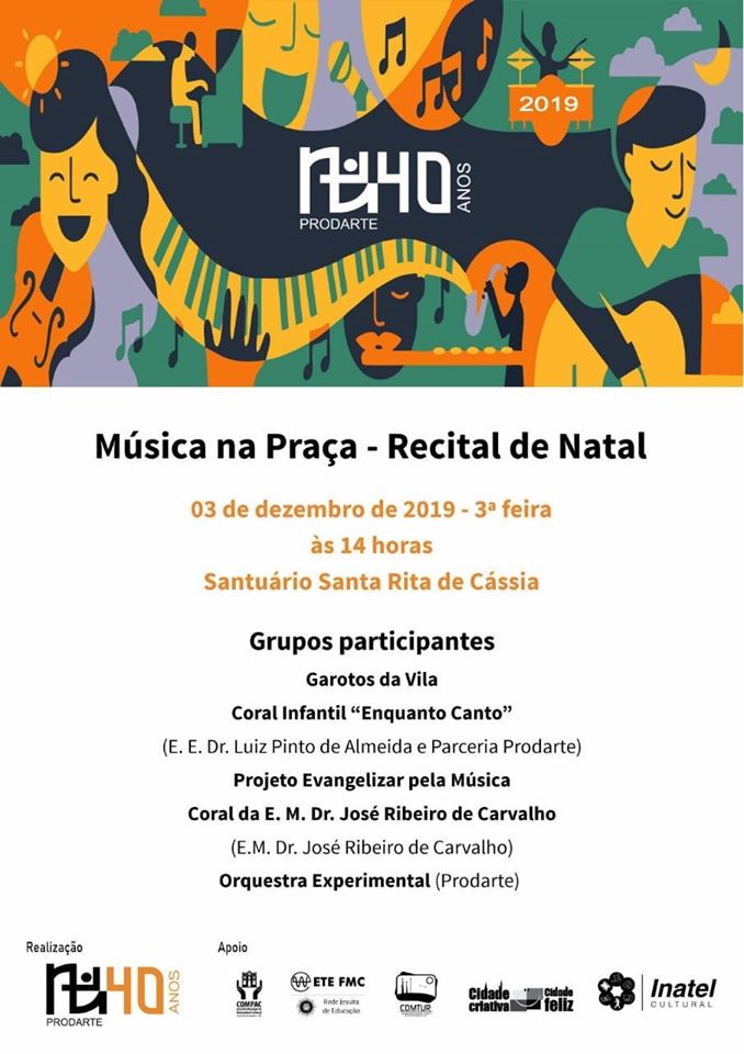 O espetáculo Música na Praça, faz parte de uma Edição Especial Comemorativa dos 40 anos da PRODARTE – Associação Pró – Desenvolvimento Através da Arte. É uma linda iniciativa da associação, já tradicional em nossa cidade. Suas últimas edições aconteceram dentro do Santuário de Santa Rita de Cássia com a proposta de levar o evento principalmente para as crianças e jovens de nossas escolas.