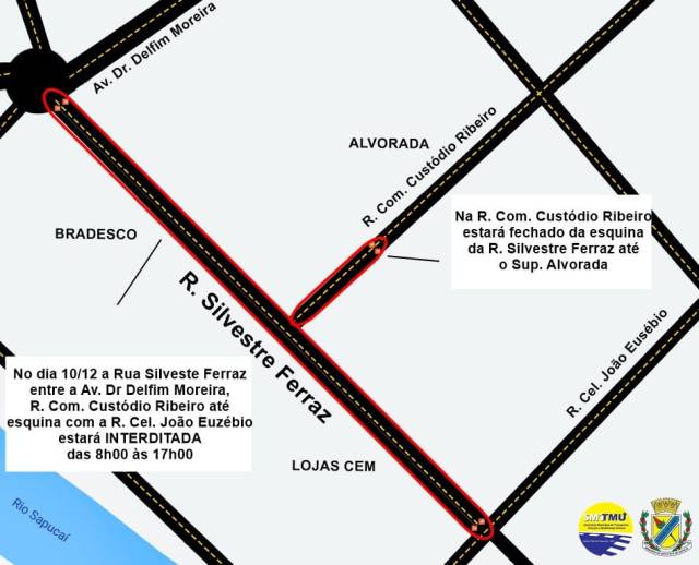 Em Santa Rita do Sapucaí, a Secretaria Municipal de Transporte Trânsito e Mobilidade Urbana comunica que na terça feira, dia 10 de dezembro a Rua Silvestre Ferraz estará fechada ao trânsito das 8h00 às 17h00 entre a Av. Dr Delfim Moreira, Rua Comendador Custódio Ribeiro e Rua Cel João Euzébio.