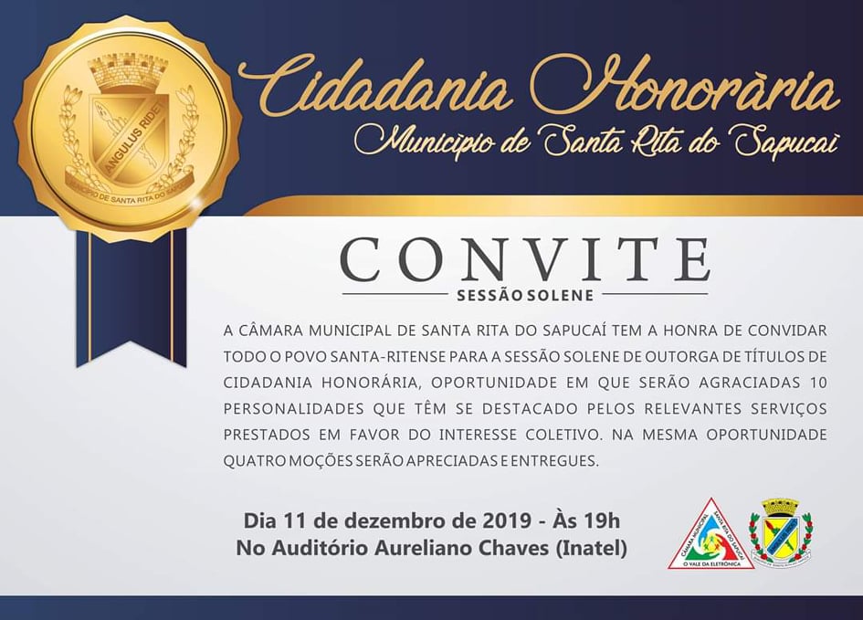 Com grande satisfação, a Câmara Municipal convida todo o povo de Santa Rita do Sapucaí para acompanhar a realização da Sessão em que serão outorgados Títulos de Cidadania Honorária Santa-ritense a dez personalidades que se destacam pelos relevantes serviços prestados em favor do interesse coletivo.