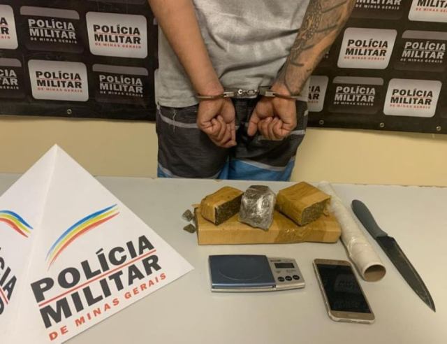 Foi localizado em seguida, em uma gaveta no armário da cozinha, mais uma barra grande de maconha prensada, totalizando cerca de 1,5kg , além de objetos para preparar para a venda.