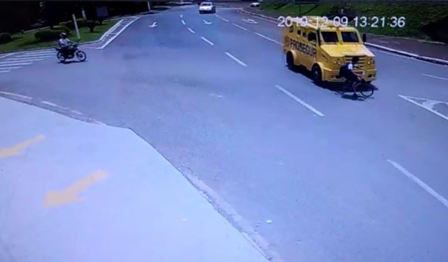 Um menino de 12 anos sofreu escoriações após ser atropelado por um carro-forte na MG-050, em Passos. O acidente foi registrado por uma câmera de monitoramento, que flagrou quando o jovem ciclista cruza a rodovia sem diminuir a velocidade e é atingido pelo veículo.