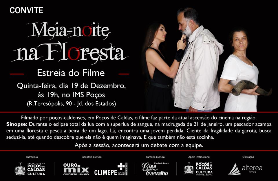 O curta-metragem poços-caldense Meia-noite na Floresta irá estrear na quinta-feira, dia 19 de Dezembro, às 19h, no IMS Poços (Rua Teresópolis, 90). A entrada é gratuita e terá distribuição de senha 30 minutos antes da sessão, com limite de duas senhas por pessoa. Dirigido por Marcelo Leme, estrelado por Clisthenis Betti, Fernanda Lemes e Selma Mistura, e produzido pela Alterea Filmes, a obra foi inteiramente filmada em Poços de Caldas.