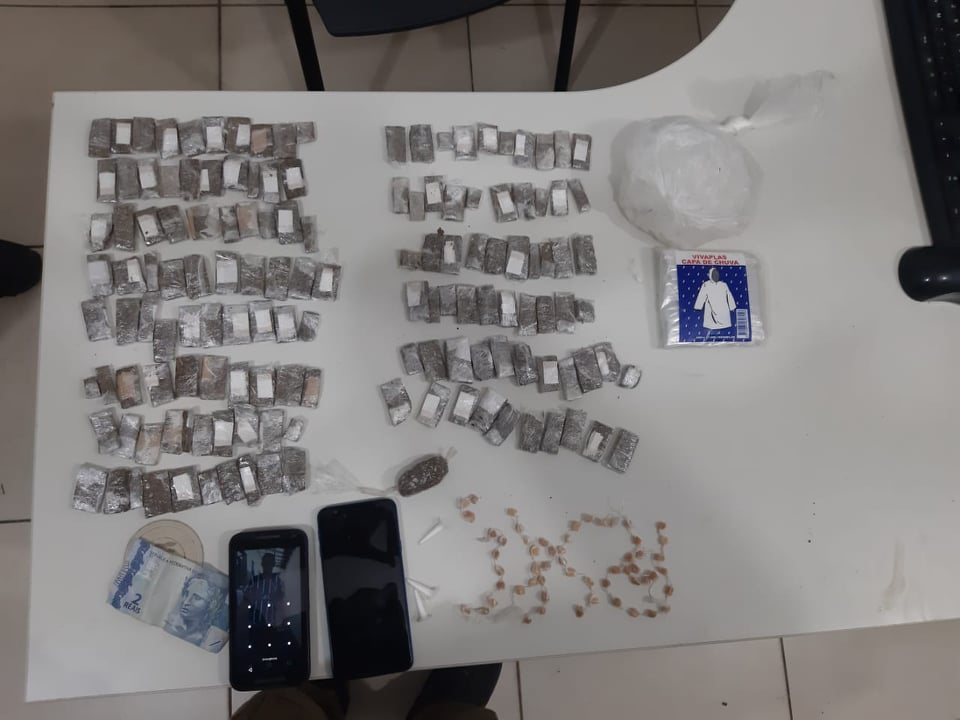 A Polícia Militar encontrou os autores no local informado, local onde foram abordados, em continuidade foi realizado uma varredura no matagal em frente ao local onde os autores se encontravam, sendo encontrado 60 Buchas de Maconha e 40 Pedras de Crack no pé de uma árvore.