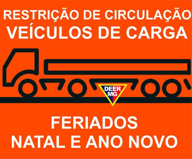A circulação dos veículos de grande porte será proibida em rodovias de pista simples sob responsabilidade do Departamento de Edificações e Estradas de Rodagem de Minas Gerais (DEER/MG), nesta quarta-feira (25/12), das 14h às 22h, e na quarta (dia 1/1/2020), também das 14h às 22h.