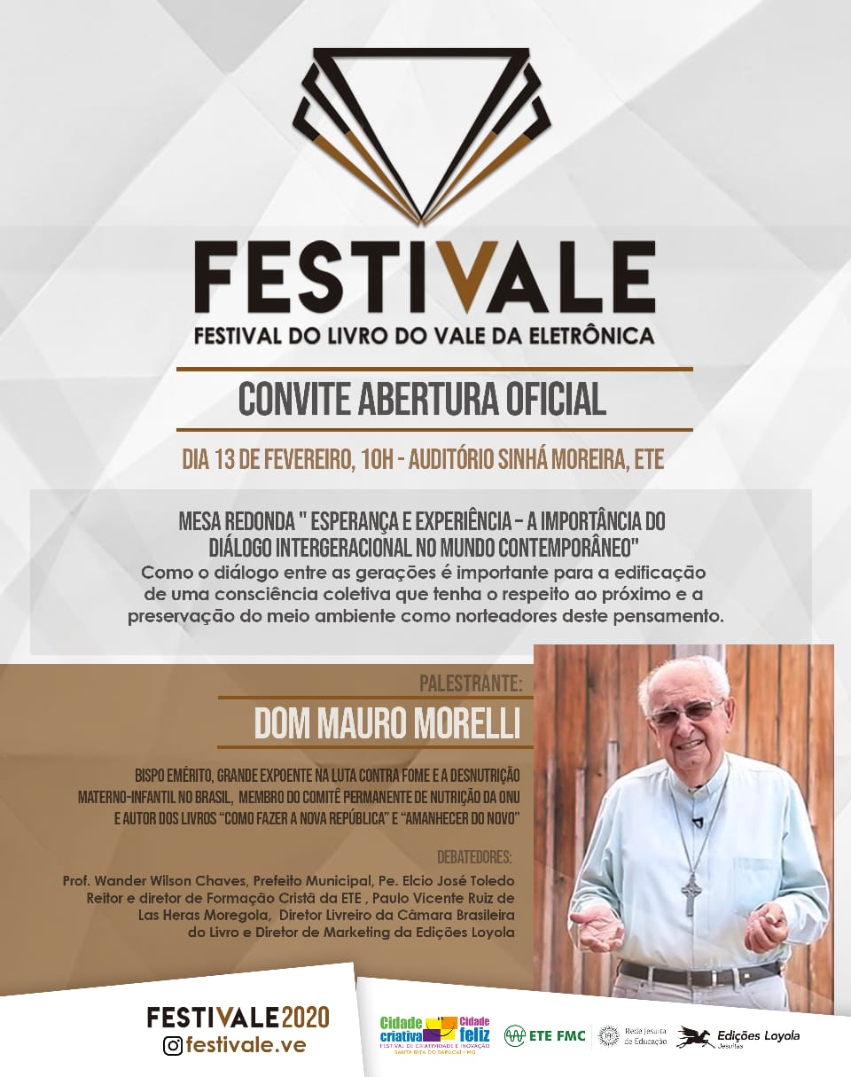 Com o tema “Esperança e Experiência, a importância do diálogo intergeracional no mundo contemporâneo”, a palestra de abertura oficial do II Festival do Livro do Vale da Eletrônica – FESTIVALE, será ministrada por Dom Mauro Morelli, Bispo Emérito, embaixador da ONU e criador, junto com o sociólogo Betinho, do projeto Cidadania contra a Fome.