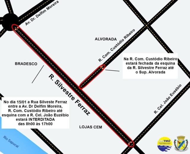 Em Santa Rita do Sapucaí, a Secretaria Municipal de Transporte Trânsito e Mobilidade Urbana comunica que na quarta feira, dia 15 de janeiro a Rua Silvestre Ferraz estará fechada ao trânsito das 8h00 às 17h00 entre a Av. Dr Delfim Moreira, Rua Comendador Custódio Ribeiro e Rua Cel João Euzébio.
