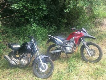 Próximo da motocicleta Honda XRE havia também outra motocicleta, uma Honda CG Titan de cor preta, também sem placa de identificação. Consultada, foi constatado que o veículo teria sido roubado na cidade de Itapeva, no mês de dezembro de 2019.