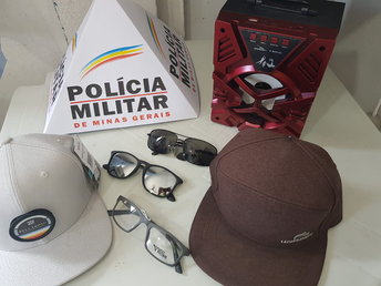O autor foi abordado e durante as buscas pessoais, foi localizada a referida caixa de som subtraída da loja de eletrônicos, além de outros pertences que foram furtados de um estabelecimento de bijuterias, sendo dois óculos de sol, um óculos de grau e dois bonés.