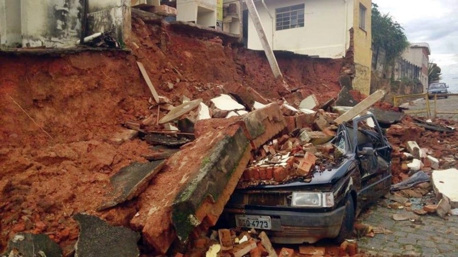 Muro desaba e cai sobre carro durante chuva no Centro de Cássia
