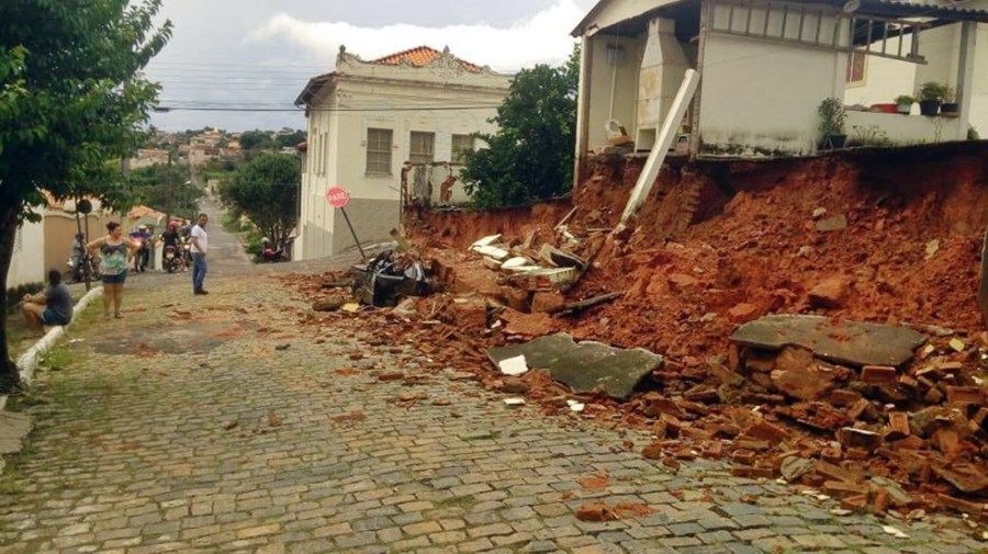 Muro desaba e cai sobre carro durante chuva no Centro de Cássia